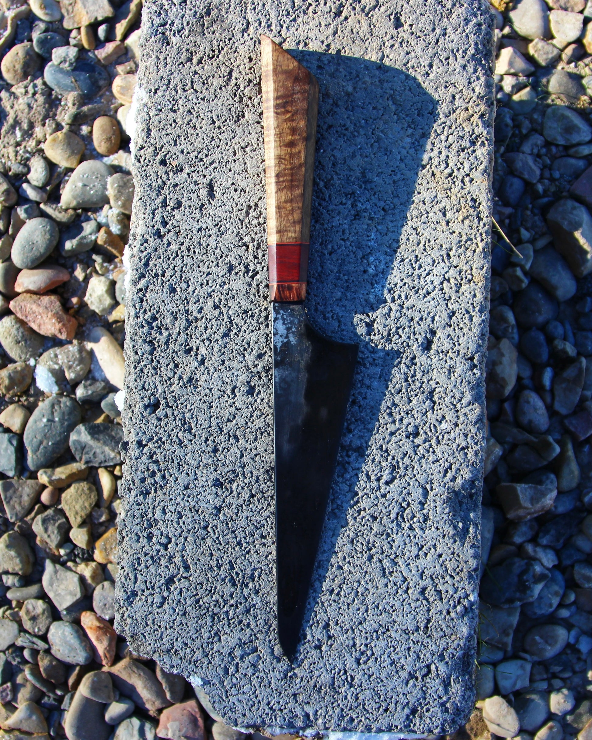 Hand forged in-house from 1084 carbon steel etched blade, paired with a stabilized curly Blonde myrtlewood handle, and padauk spacer.