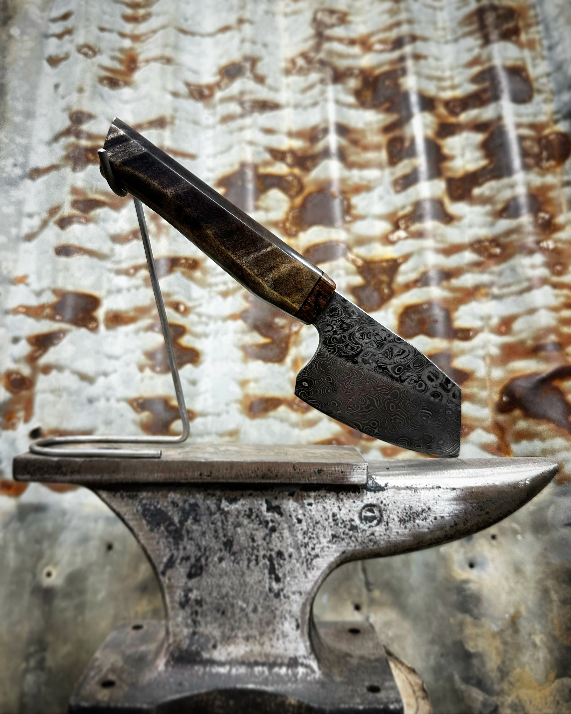 400 layer raindrop Damascus, stabilized double-dyed curly maple handle with maple burl bolster