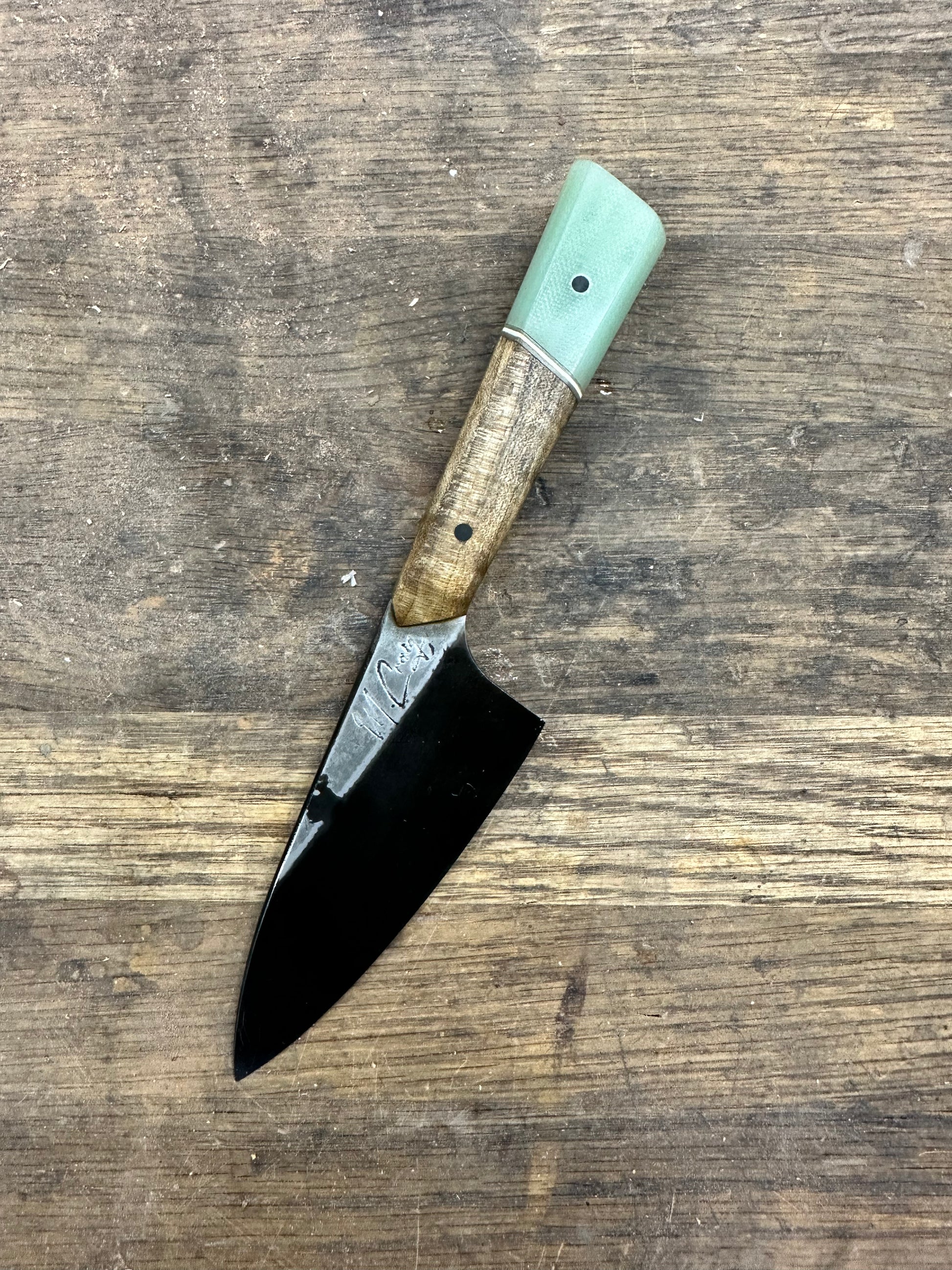 3.5” 1084 mini-chef/paring, with stabilized maple and jade g10 scales.